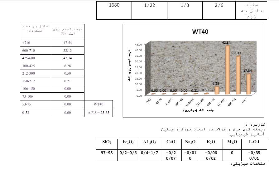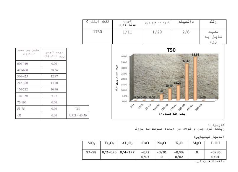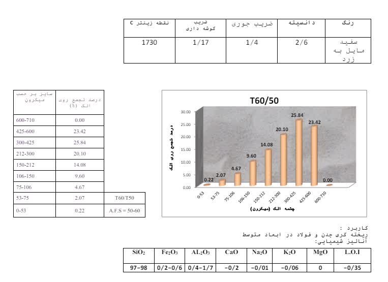 این سایز دانه باعث میشود ماسه دارای نفوذپذیری مناسب، مقاومت حرارتی بالا و پایداری مکانیکی خوبی باشد. به همین دلیل در ریختهگری فلزات برای قالبگیری، بهویژه در چدن و فولاد، بسیار کاربرد دارد؛ زیرا خروج گاز را بهتر انجام میدهد و احتمال ایجاد عیوب گازی را کاهش میدهد.
